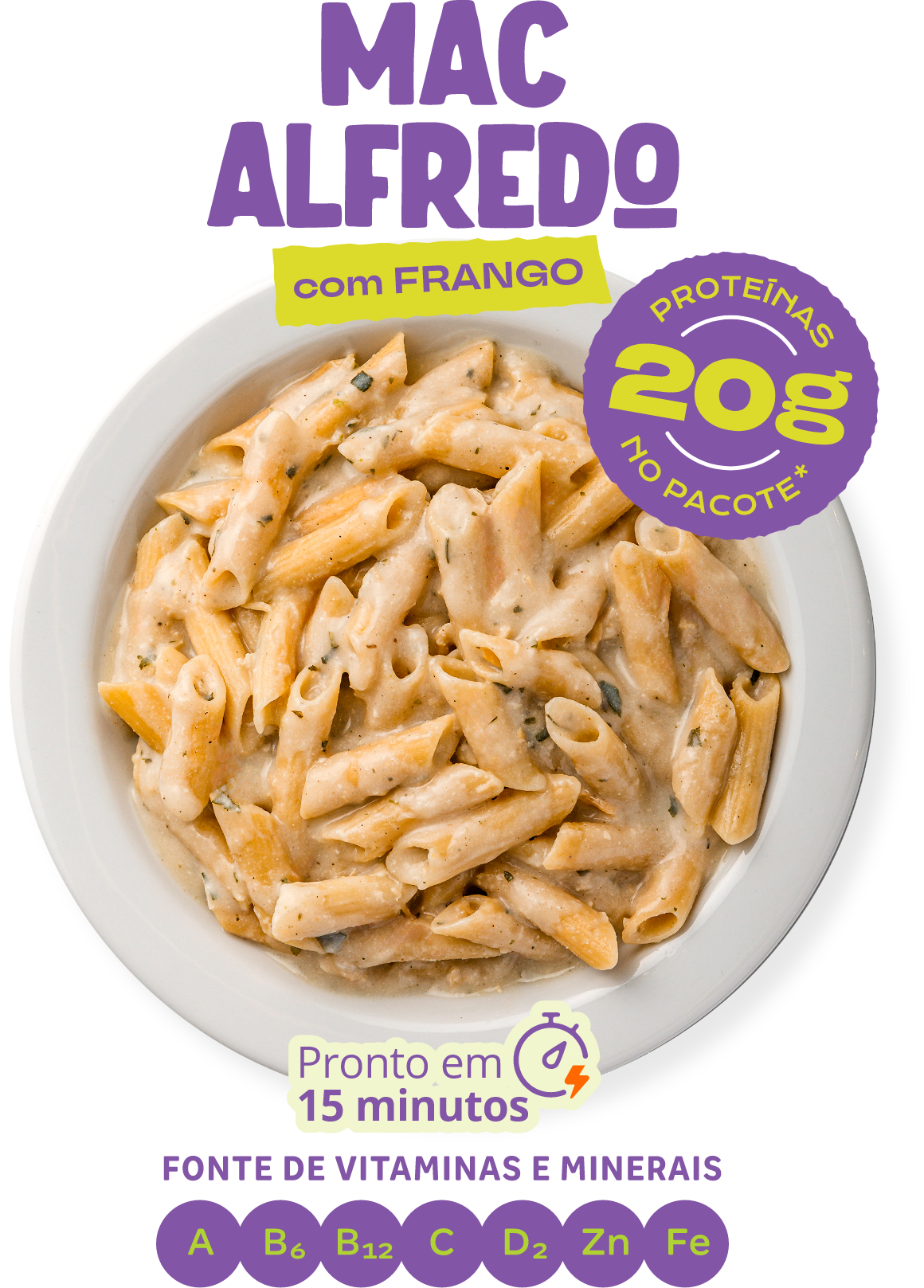 Com incríveis 20 g de proteína, fonte de vitaminas e minerais e frango suculento, fica pronto em 15 minutos. Praticidade e sabor nos seus dias corridos.