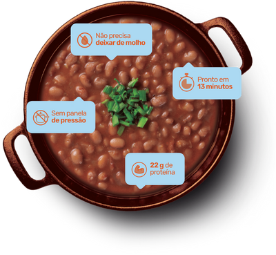 Sou a versão melhorada do ingrediente mais tradicional do almoço brasileiro. Por ser desidratado, não preciso de panela de pressão e nem ficar de molho. Parceiro número 1 do arroz, sou rico em vitaminas (A, B, C e D) e fonte de ferro e zinco.